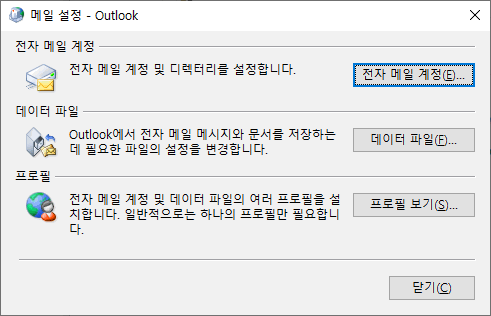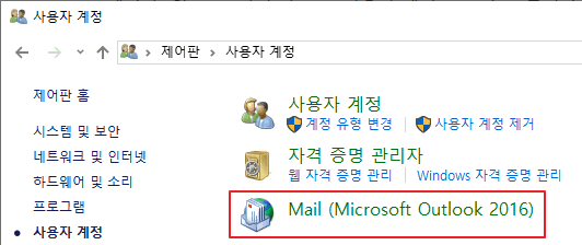 - 제어판 (윈도 10 설정 말고) > 사용자 계정 > Mail 로 들어가서
