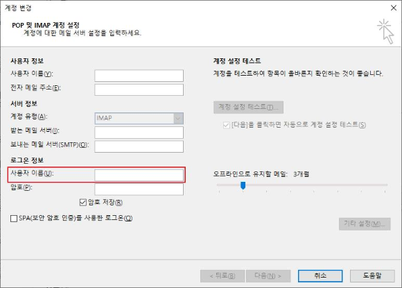예전 아웃룩 2016까지 쓰던 창이 나타나고요. IMAP 계정 상세 설정 창까지 가면 "로그인 계정" 입력란이 있습니다.