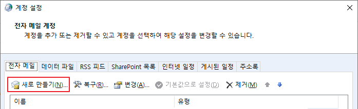 - [전자 메일 계정] 버튼을 눌러 아웃룩 계정 설정 창을 띄우고