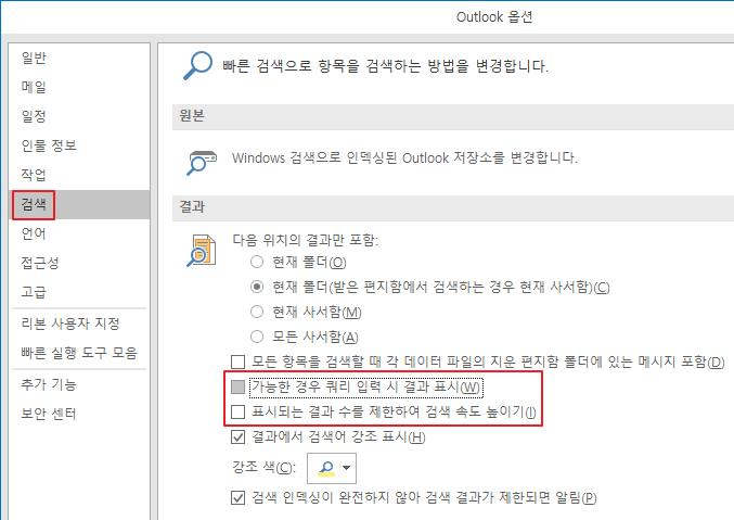 64비트 OS, 32비트 오피스이면 "Program Files" 폴더 대신 "Program Files (x86)" 폴더에서 찾아주세요. - 아웃룩 검색 옵션에서 "표시되는 결과 수를 제한하여 검색 속도 높이기" 옵션을 먼저 꺼 봤지만 소용이 없었습니다.