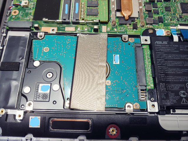 좌측 하단을 보면 HDD, 그리고 왼쪽에 M.2 SATA (NVMe 아님!!! ㅠ) 슬롯을 볼 수 있습니다. 저는 HDD를 일반 SATA SSD로 교체할 거니까 HDD를 떼어냈습니다. 고정 나사 4개를 풀어내고 커넥터가 손상되지 않도록 HDD 왼쪽을 들고 조심스럽게 왼쪽으로 잡아당기면 빠집니다.